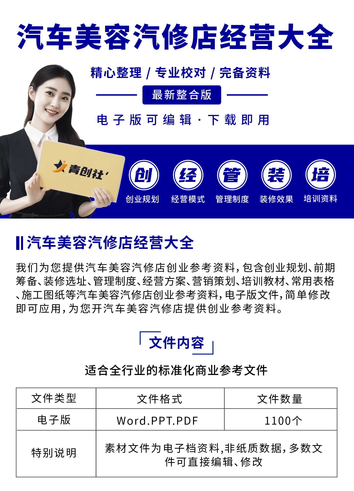 汽车美容汽修店开店经营资料大全:我们为您提供汽车美容汽修店创业参考资料,包含创业规划、前期筹备、装修选址、管理制度、经营方案、营销策划、培训教材、常用表格、施工图纸等汽车美容汽修店创业参考资料,电子版文件,简单修改即可应用,为您开汽车美容汽修店提供创业参考资料。
