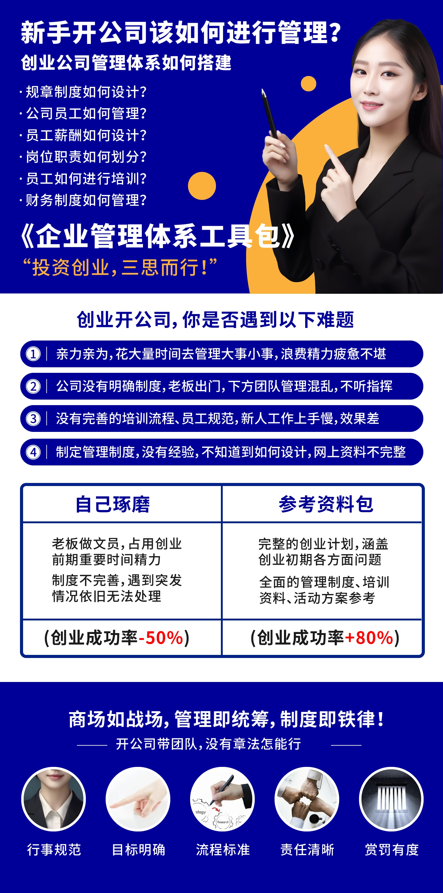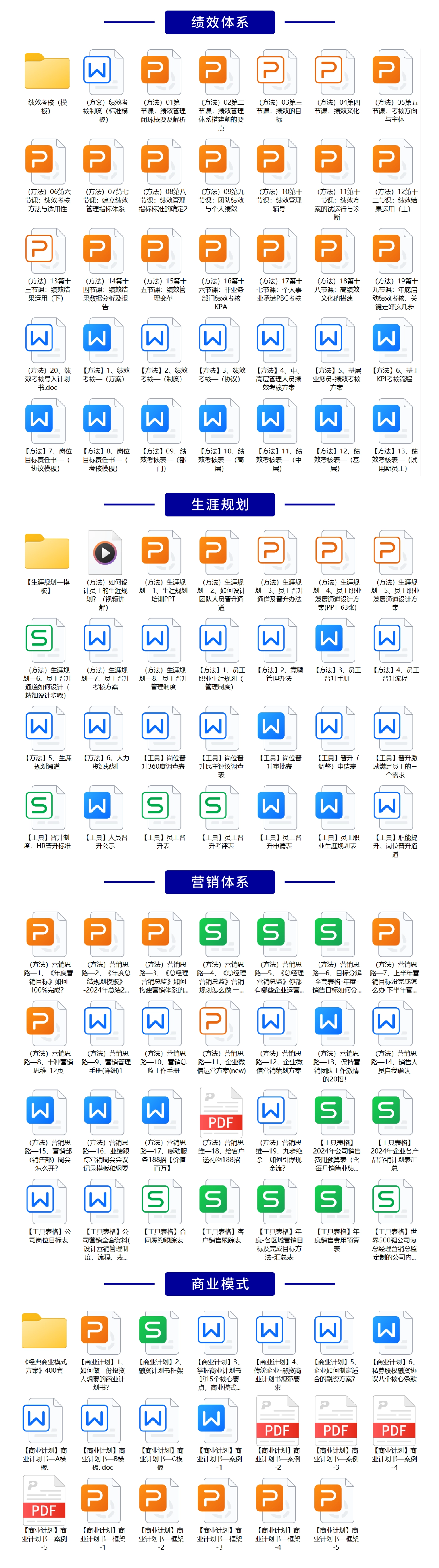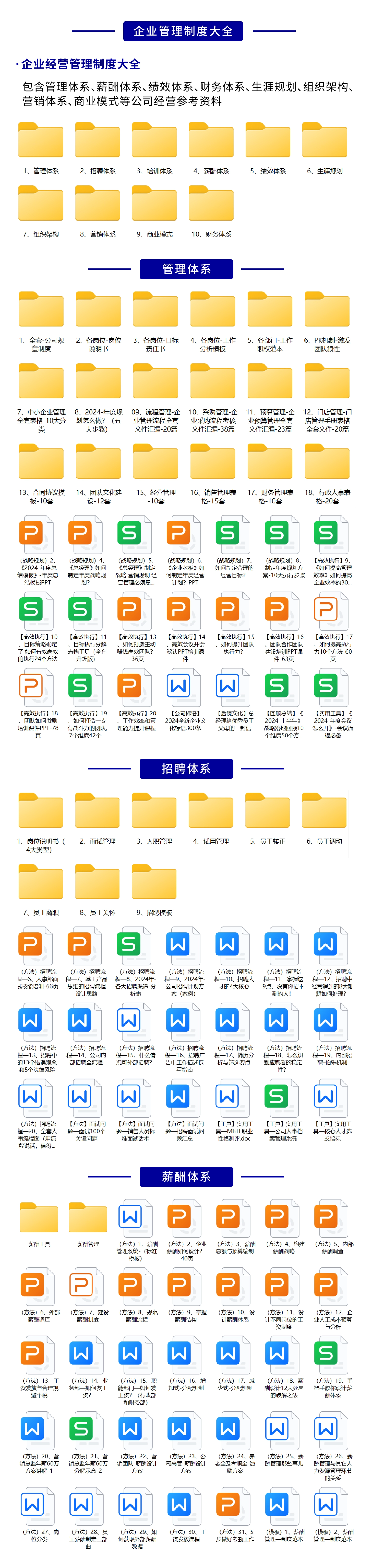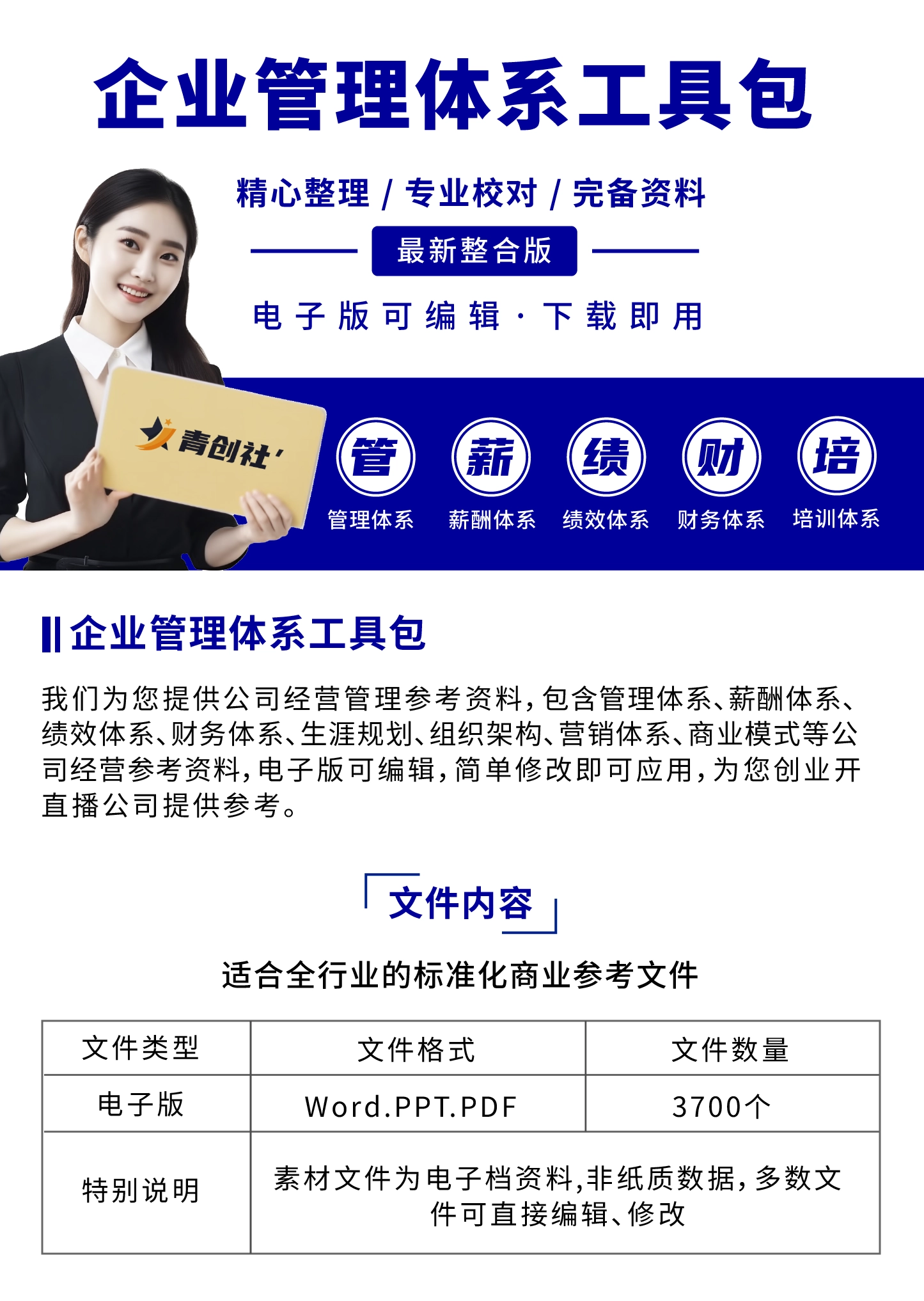企业管理制度体系全套执行落地工具包:我们为您提供公司经营管理参考资料,包含管理体系、薪酬体系、绩效体系、财务体系、生涯规划、组织架构、营销体系、商业模式等公司经营参考资料,电子版可编辑,简单修改即可应用,为您创业开直播公司提供参考。