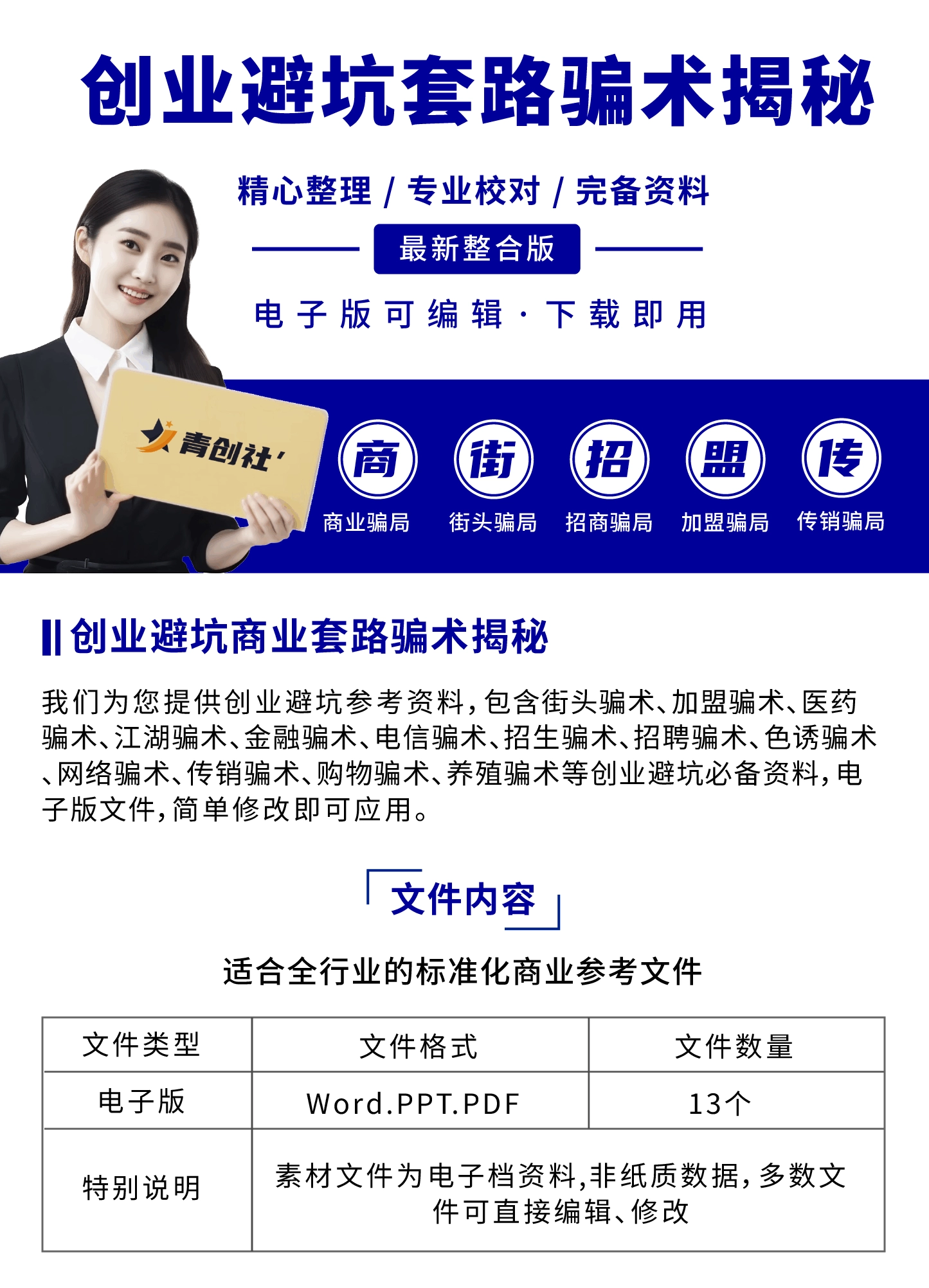 创业避坑商业套路骗术骗局揭秘大全:我们为您提供创业避坑参考资料,包含街头骗术、加盟骗术、医药骗术、江湖骗术、金融骗术、电信骗术、招生骗术、招聘骗术、色诱骗术、网络骗术、传销骗术、购物骗术、养殖骗术等创业避坑必备资料,电子版文件,简单修改即可应用。