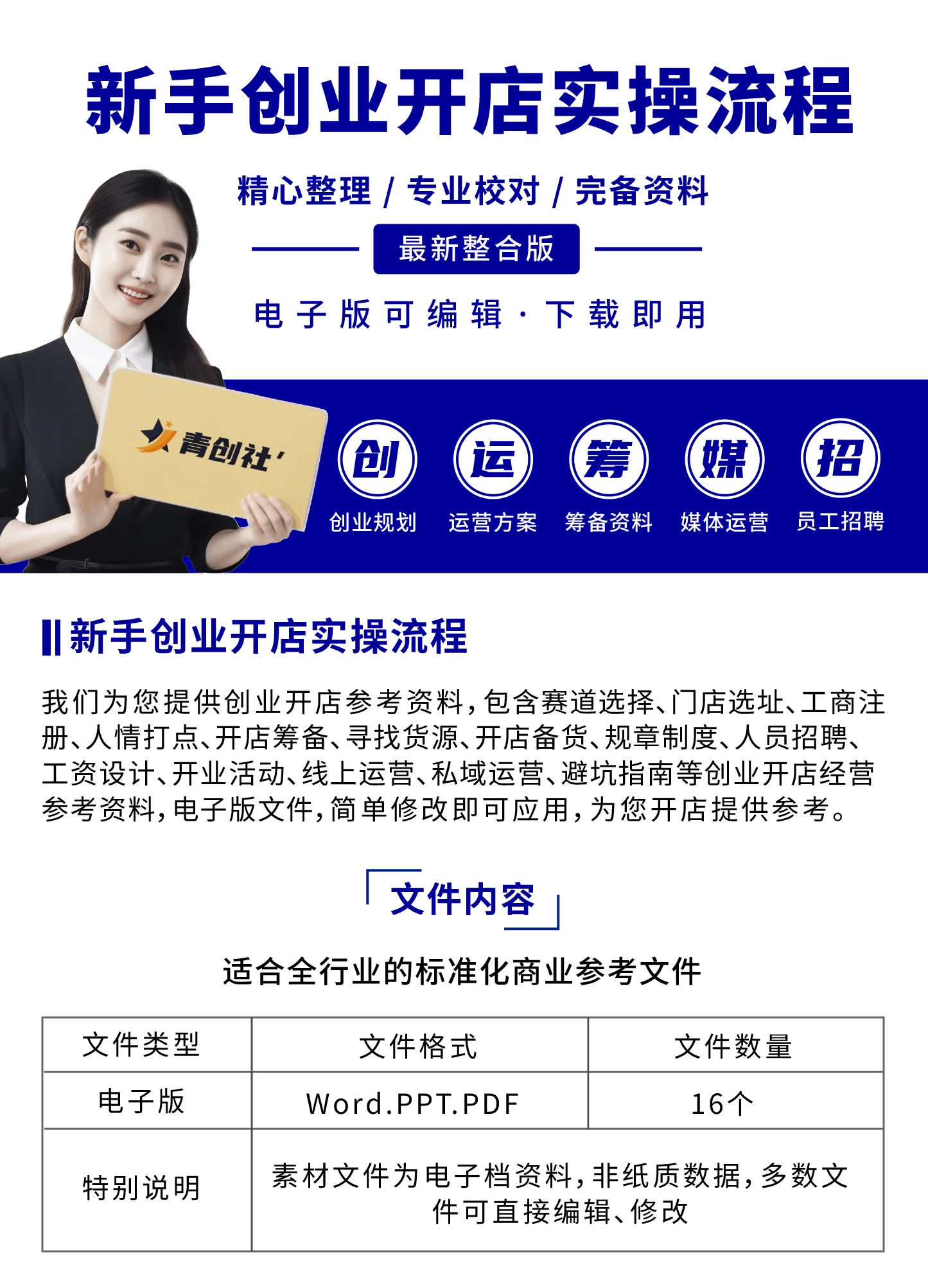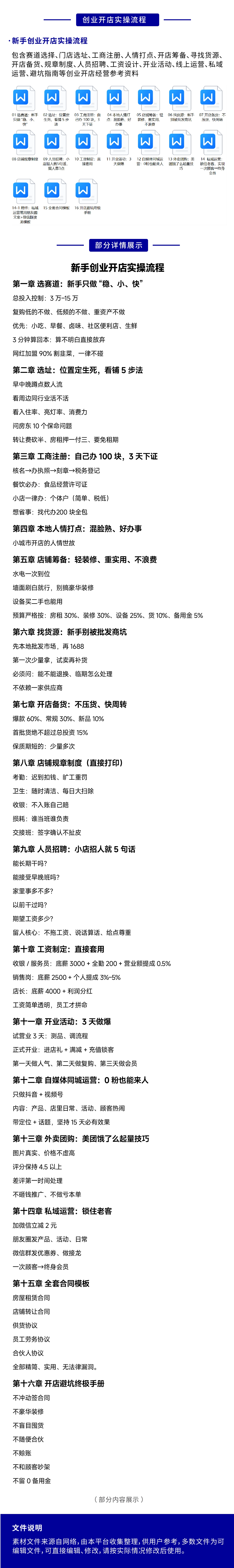 新手创业开店实操流程手册:我们为您提供创业开店参考资料,包含赛道选择、门店选址、工商注册、人情打点、开店筹备、寻找货源、开店备货、规章制度、人员招聘、工资设计、开业活动、线上运营、私域运营、避坑指南等创业开店经营参考资料,电子版文件,简单修改即可应用,为您开店提供参考。
