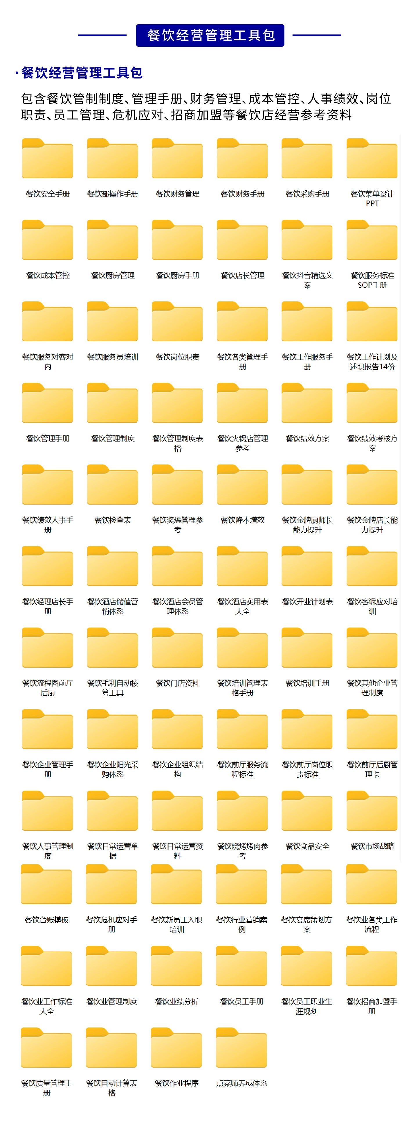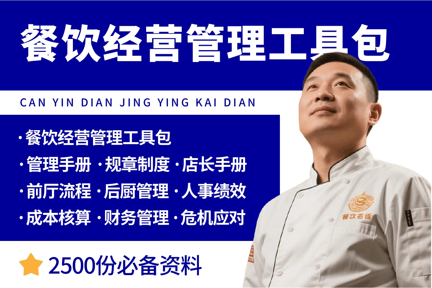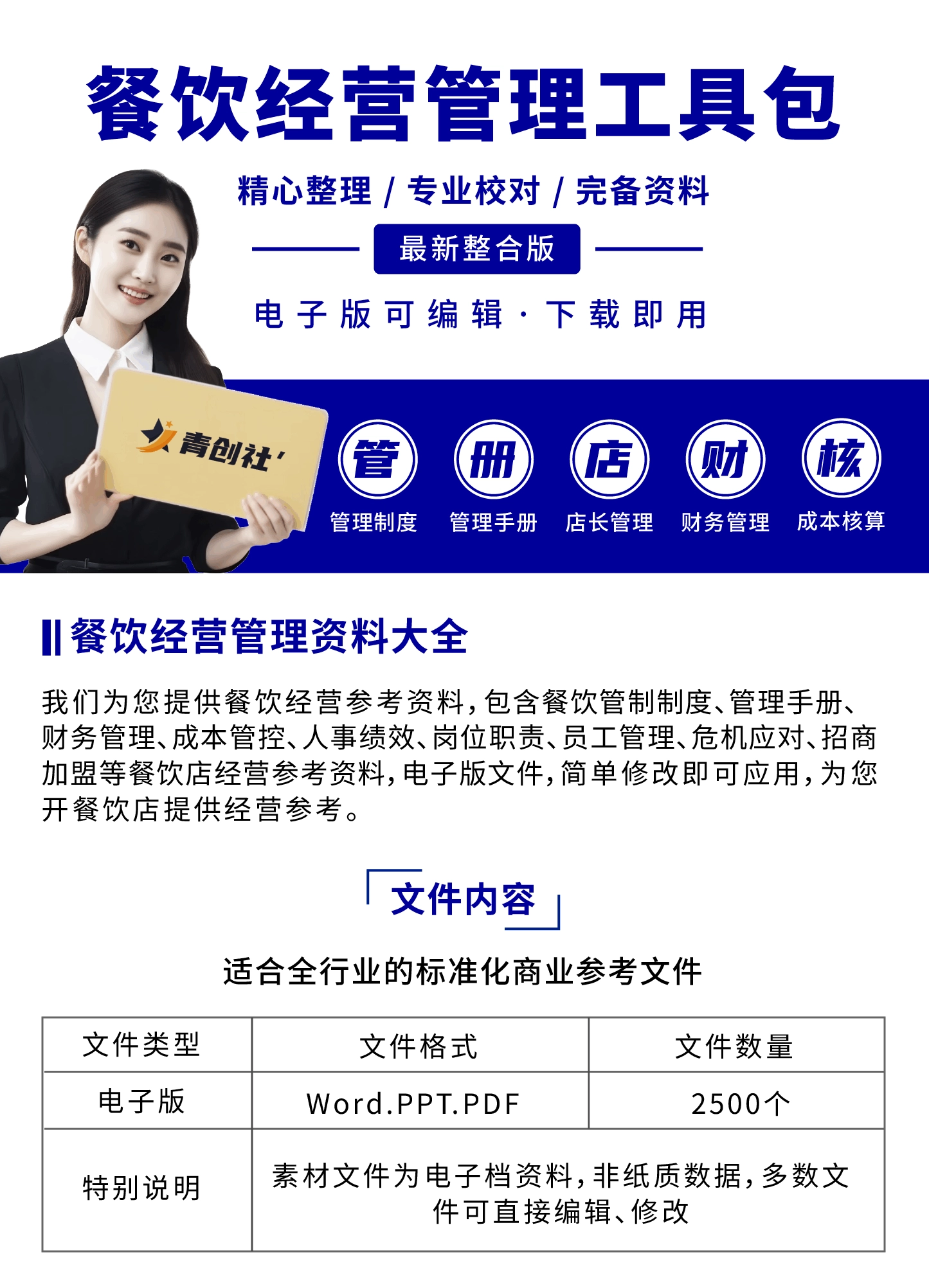 财务管理、成本管控、人事绩效、岗位职责、员工管理、危机应对、招商加盟等餐饮店经营参考资料,电子版文件,简单修改即可应用,为您开餐饮店提供经营参考。