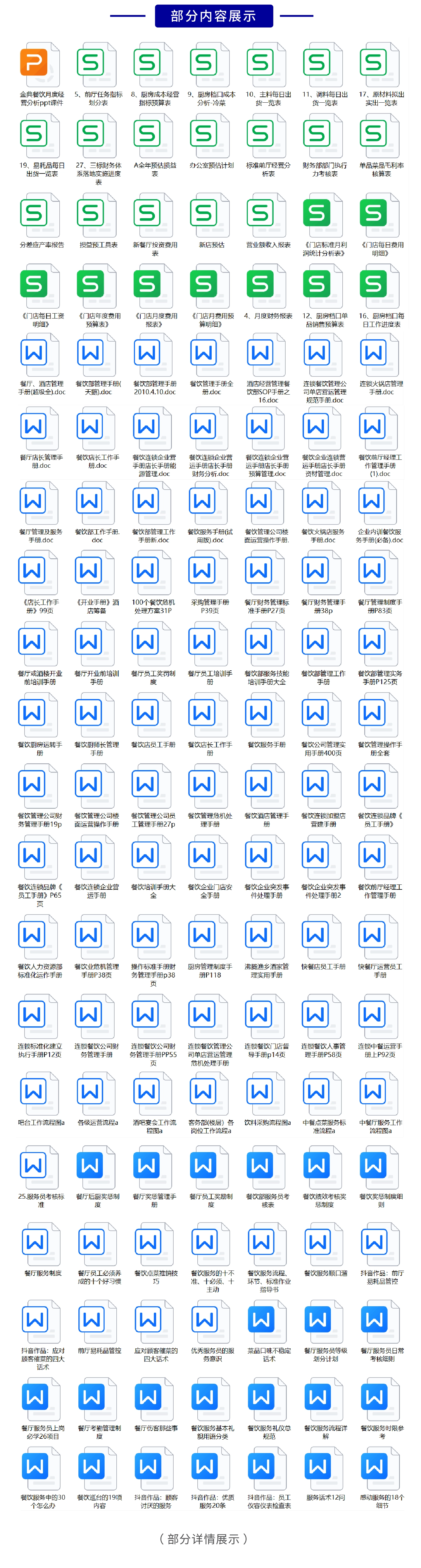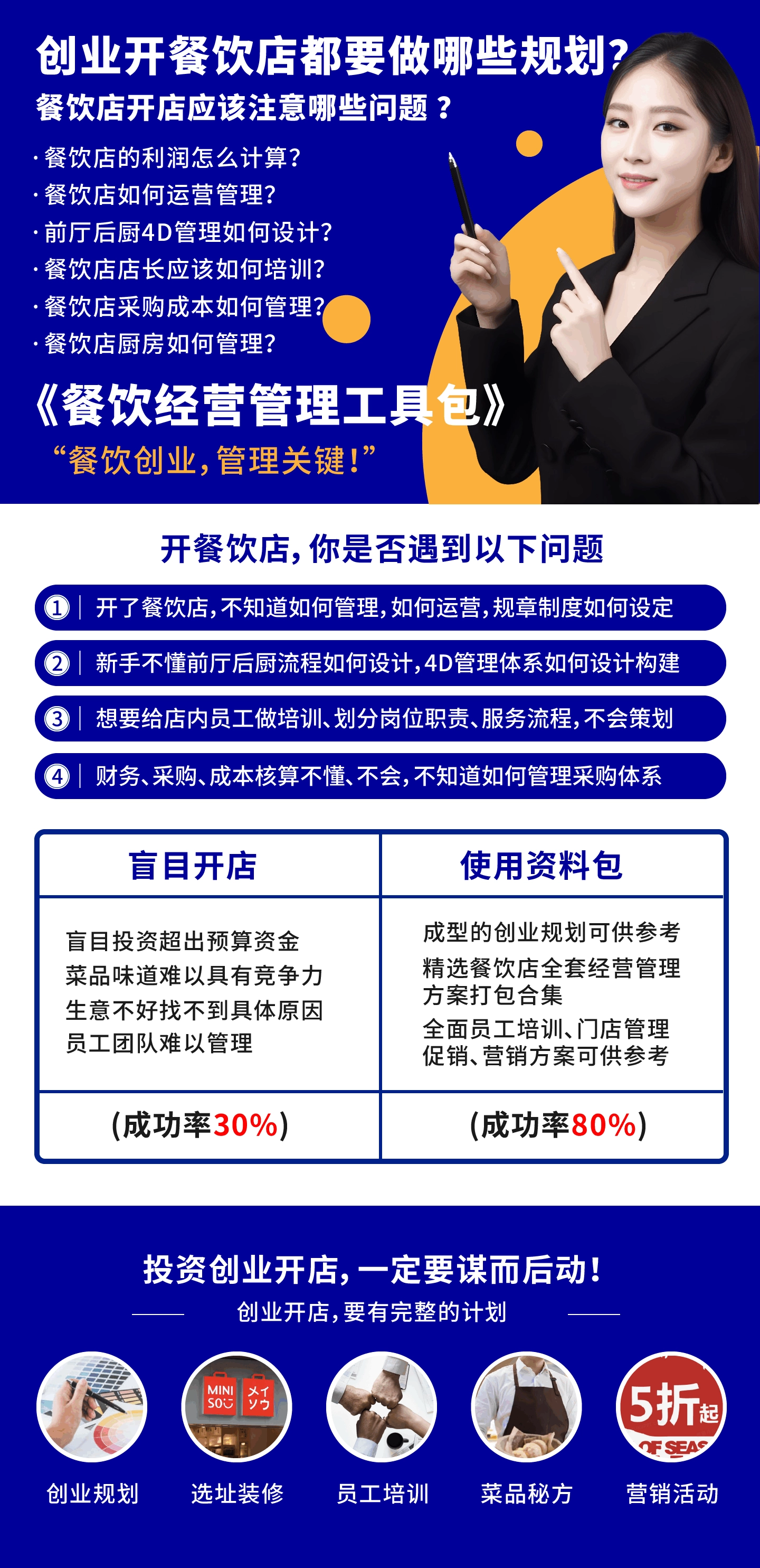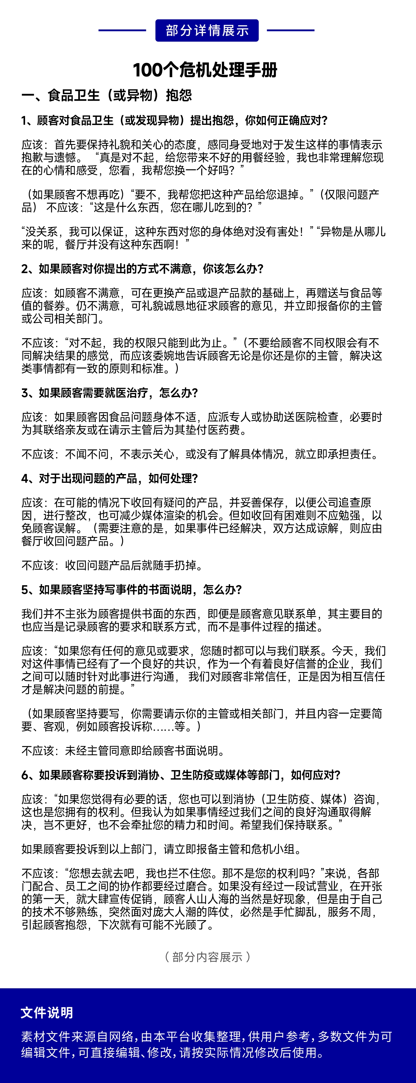 财务管理、成本管控、人事绩效、岗位职责、员工管理、危机应对、招商加盟等餐饮店经营参考资料,电子版文件,简单修改即可应用,为您开餐饮店提供经营参考。